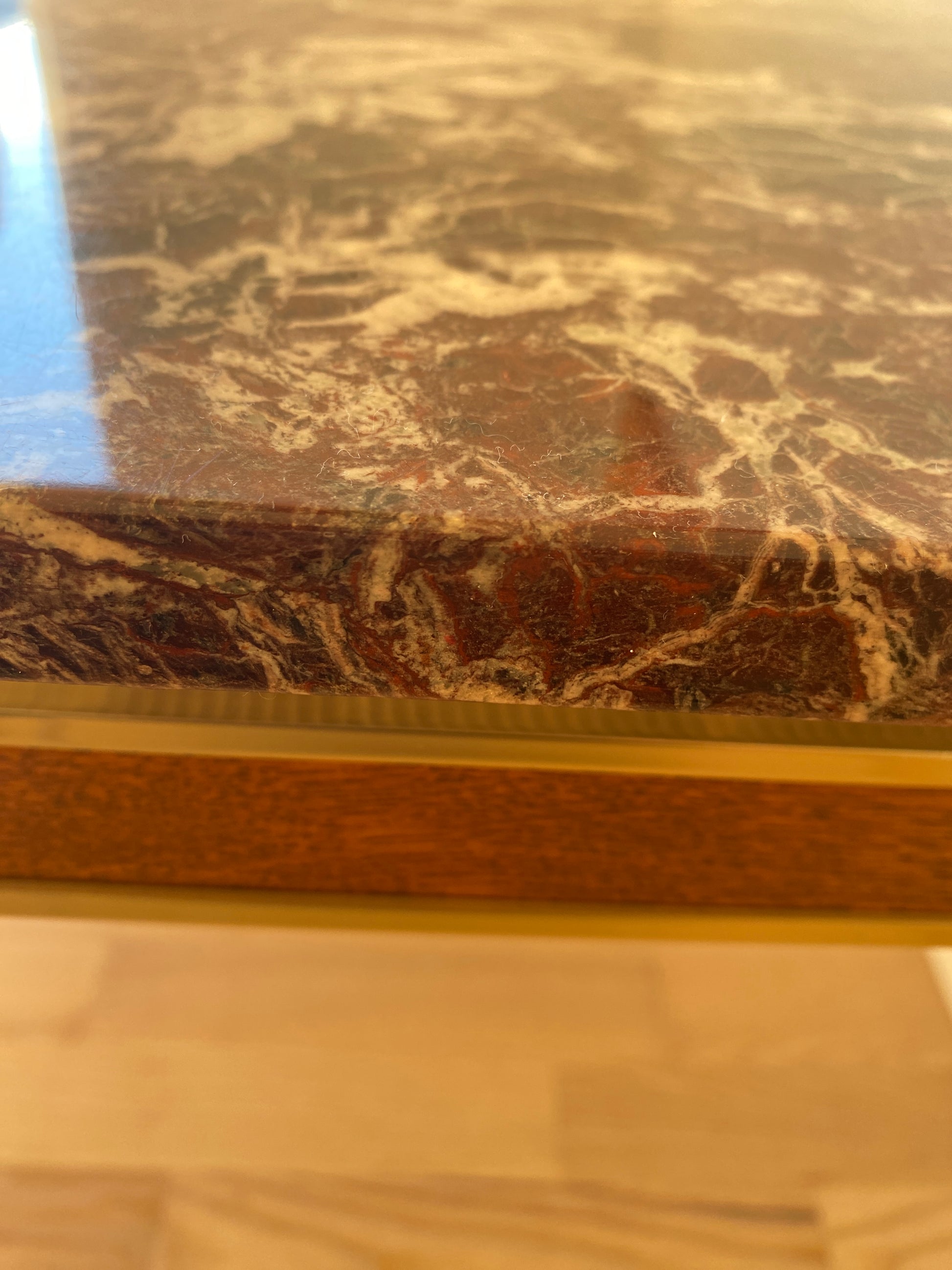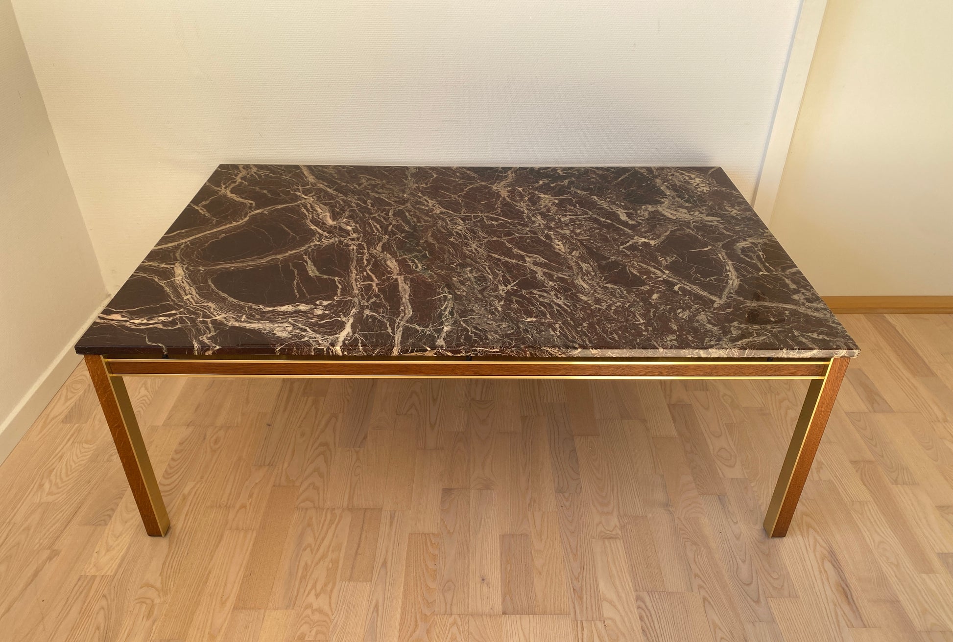 Et elegant sofabord fra Bendixen Design fra storhedstiden for Mid-Century Modernism. Den generøst store, polerede marmorplade hviler på en gennemtænkt ramme af olieret eg, suppleret af anodiserede aluminiumselementer. Dette materialevalg afspejler designfilosofien fra 1960'erne og 70'erne – fusionen af naturlig varme med industriel præcision. Bordet imponerer med sine rene proportioner og tidløse æstetik, hvilket gør det til et blikfang i ethvert opholdsrum. Et autentisk designobjekt for samlere og elskere af klassisk møbeldesign.