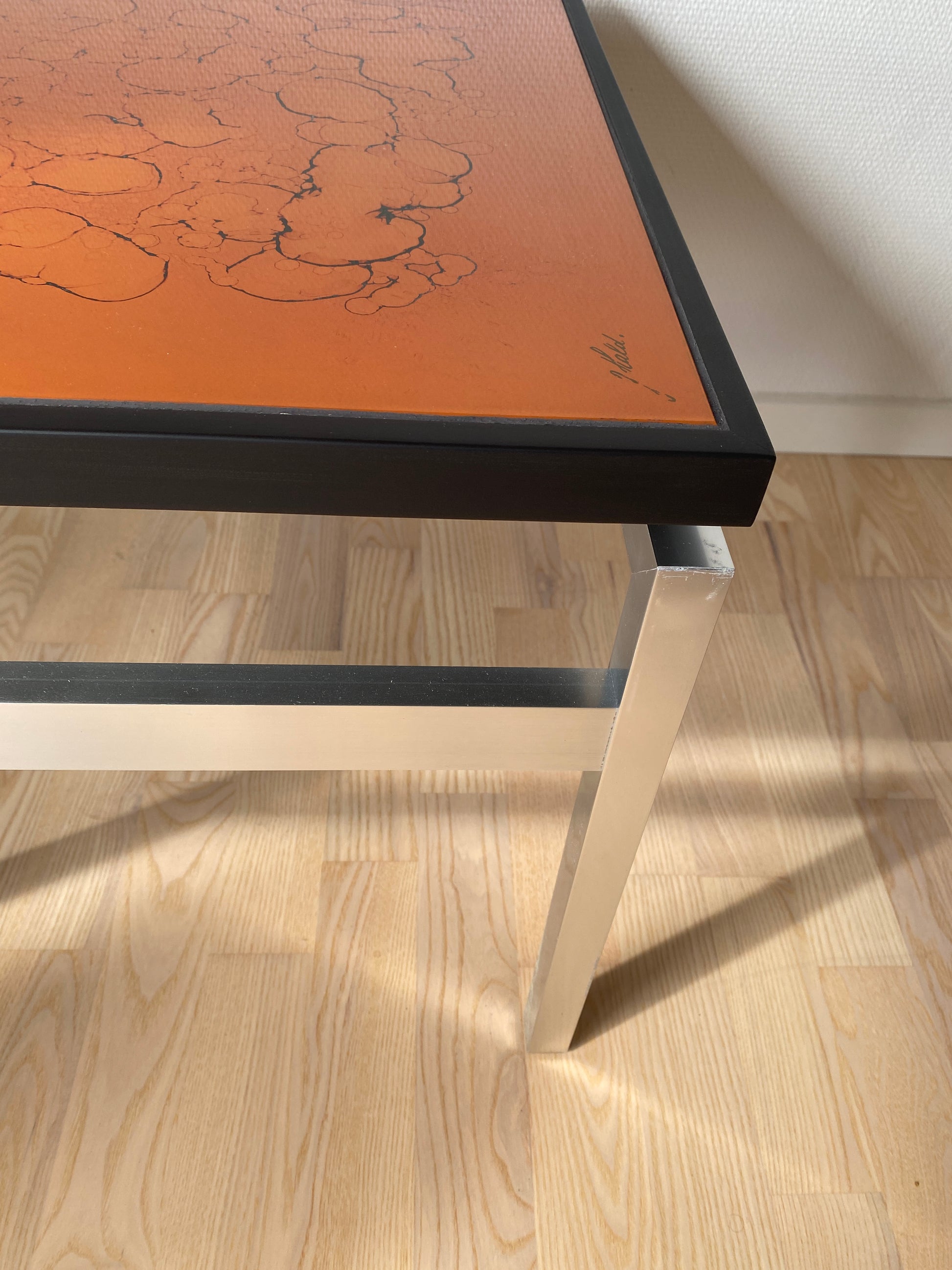 The handcrafted glass tabletop impresses with its clean lines, subtle color coordination, and the fascinating play of light and transparency – characteristic of Talopp's style. The minimalist aluminum base elegantly rounds off the design and lends the table a timeless presence.