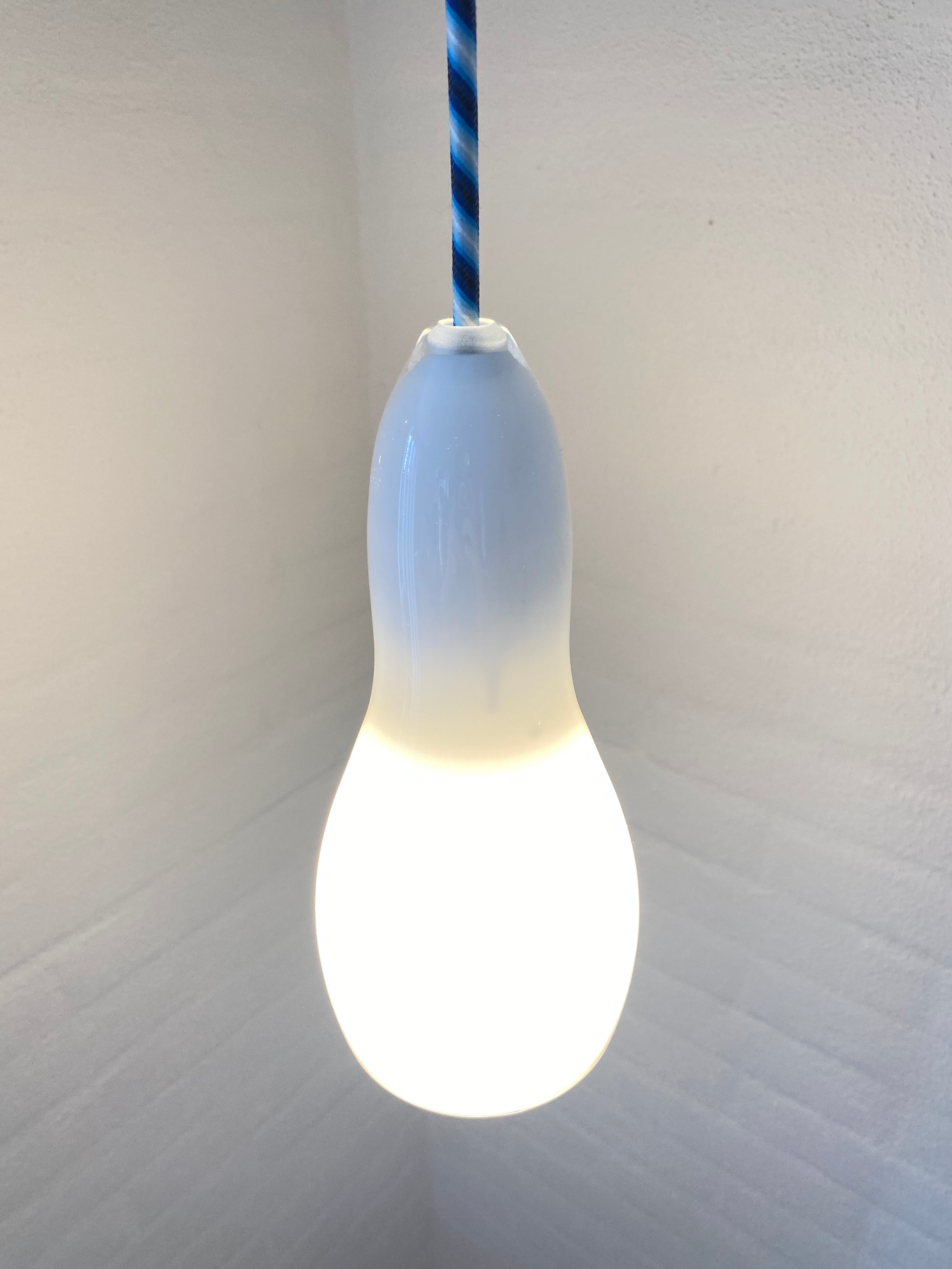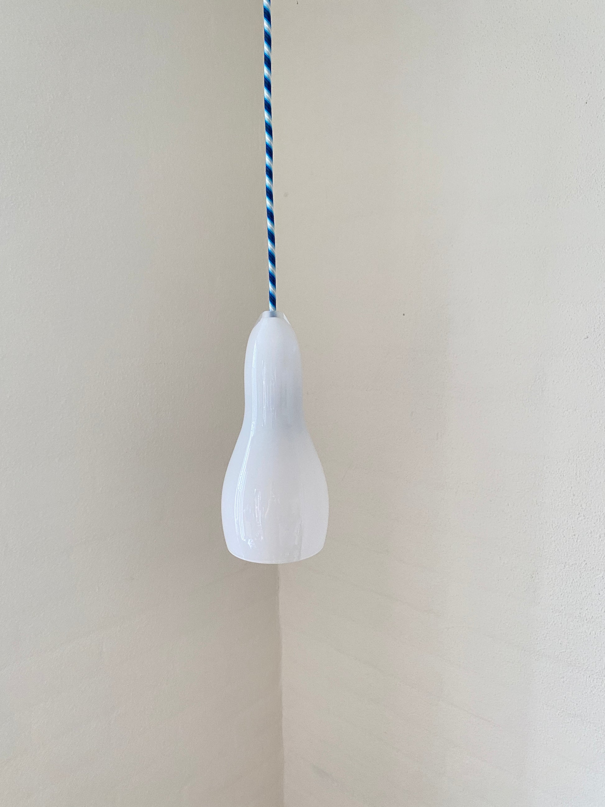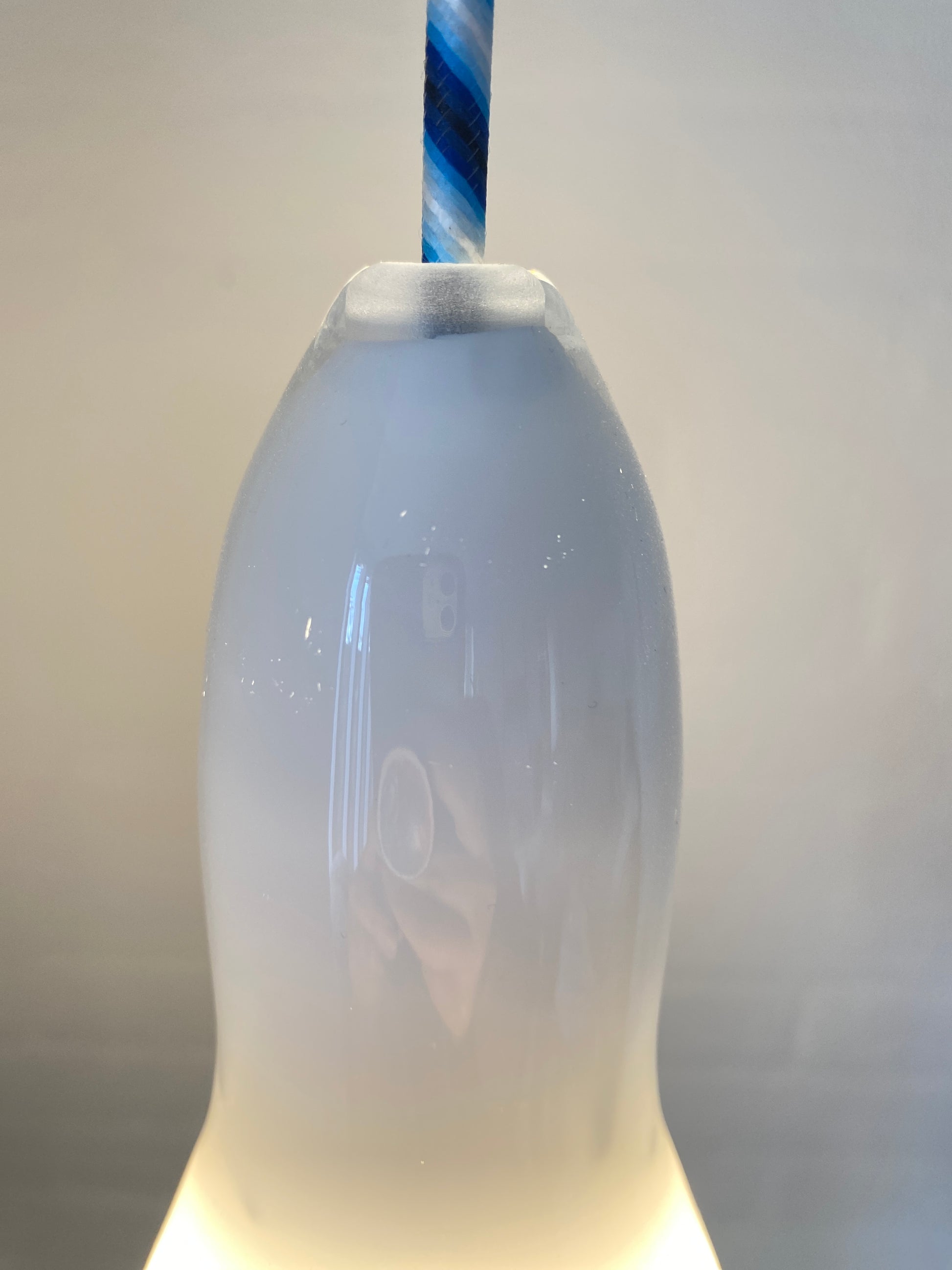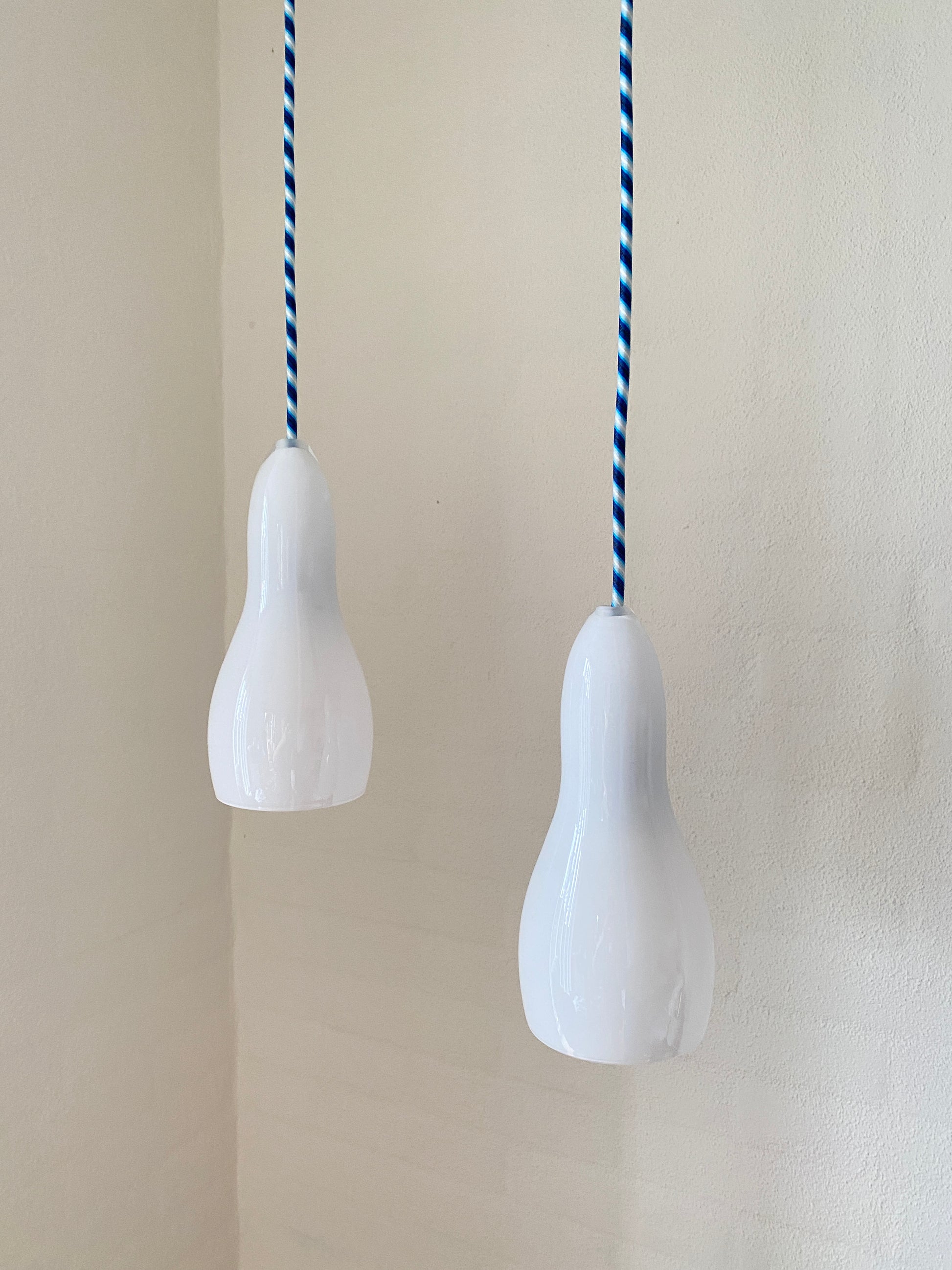 Elegantes Hängelampenset von Holmegaard mit charakteristischem Opalglas und zeitlosem Design. Das Modell H2201 wurde fachgerecht neu verkabelt und besticht durch das hochwertige blau-weiß gestreifte Kabel, das dem Klassiker eine subtile moderne Note verleiht. Die milchig-weiße Glasform diffundiert das Licht gleichmäßig und schafft eine angenehme Atmosphäre. Ideal für Liebhaber skandinavischen Designs und hochwertiger Vintage-Beleuchtung.