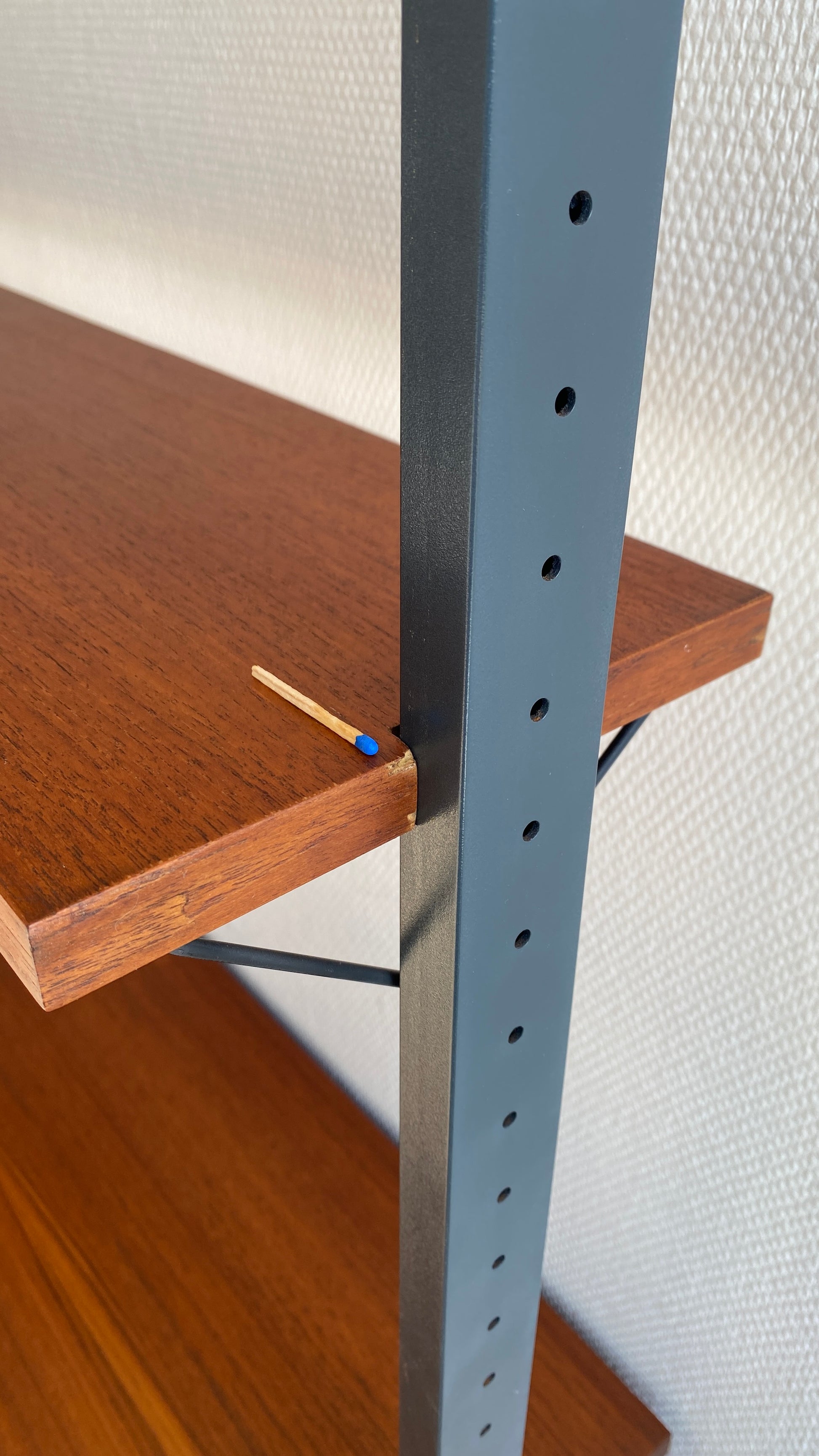 Each shelf can be adjusted according to your needs, making it highly versatile for displaying books, collectibles, or decorative objects. The system has been carefully cleaned and oiled, preserving the natural richness of the teak while maintaining excellent vintage condition.