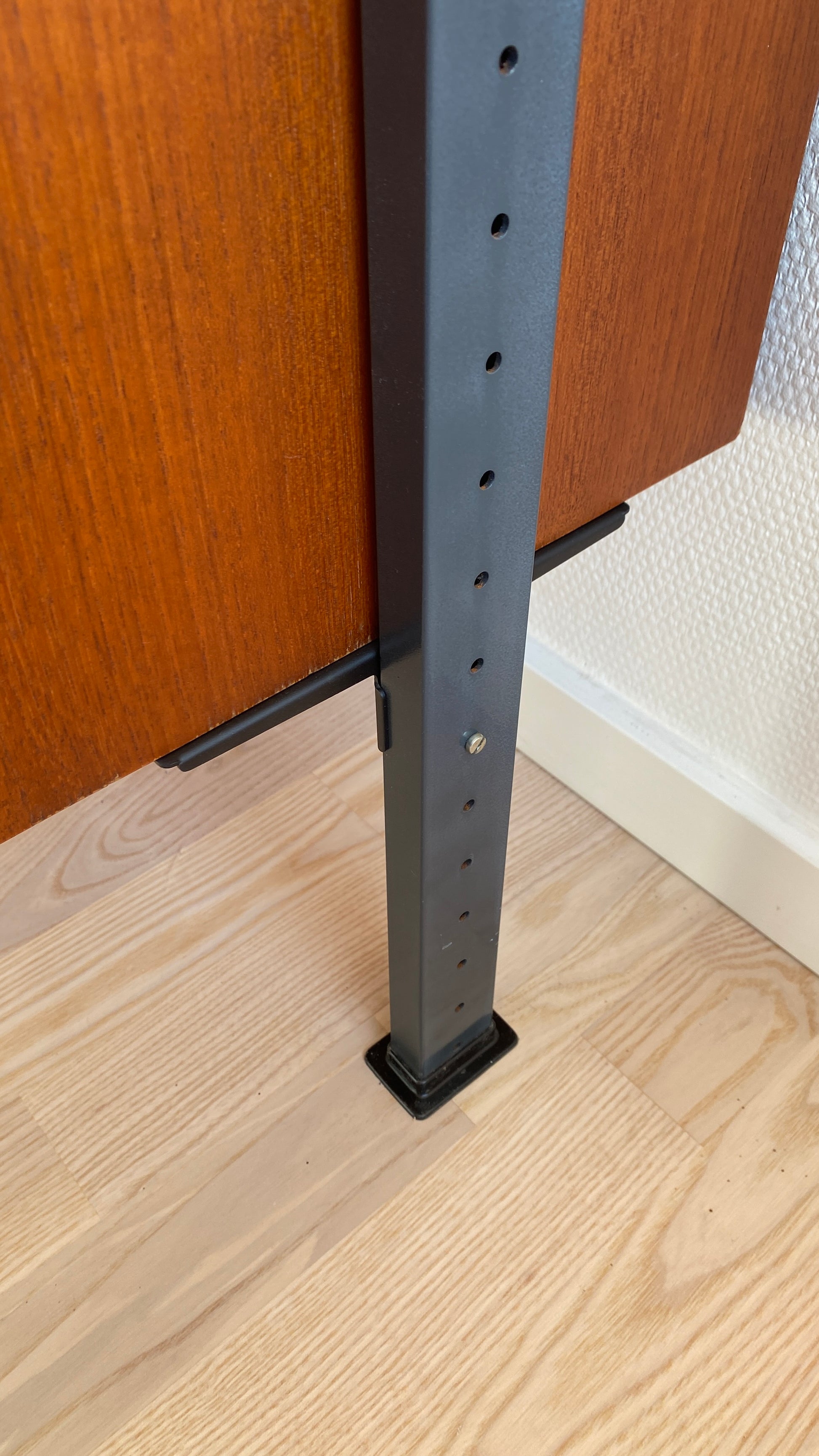 A striking example of Scandinavian Modern design, this Olof Pira teak wall shelf system combines elegance and functionality in a minimalist modular design. The system features warm teak wood shelves complemented by anthracite-colored metal rods and brackets, creating a beautiful contrast and adding architectural clarity to any interior.