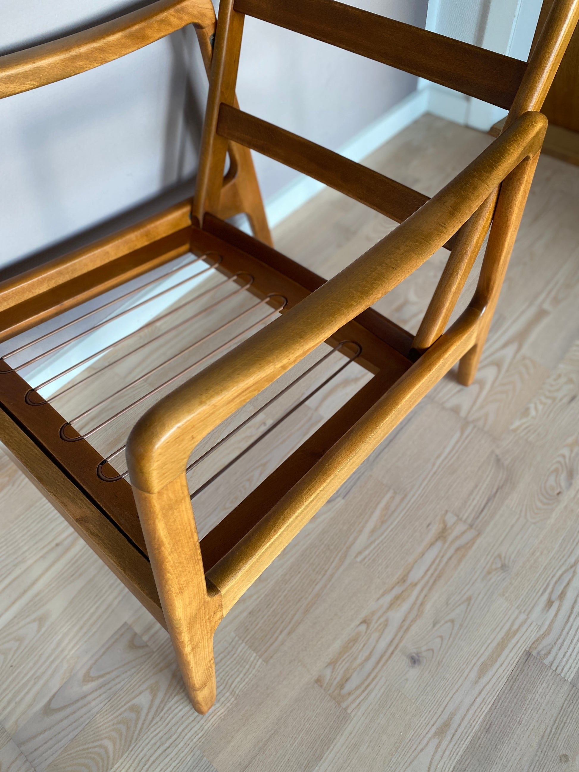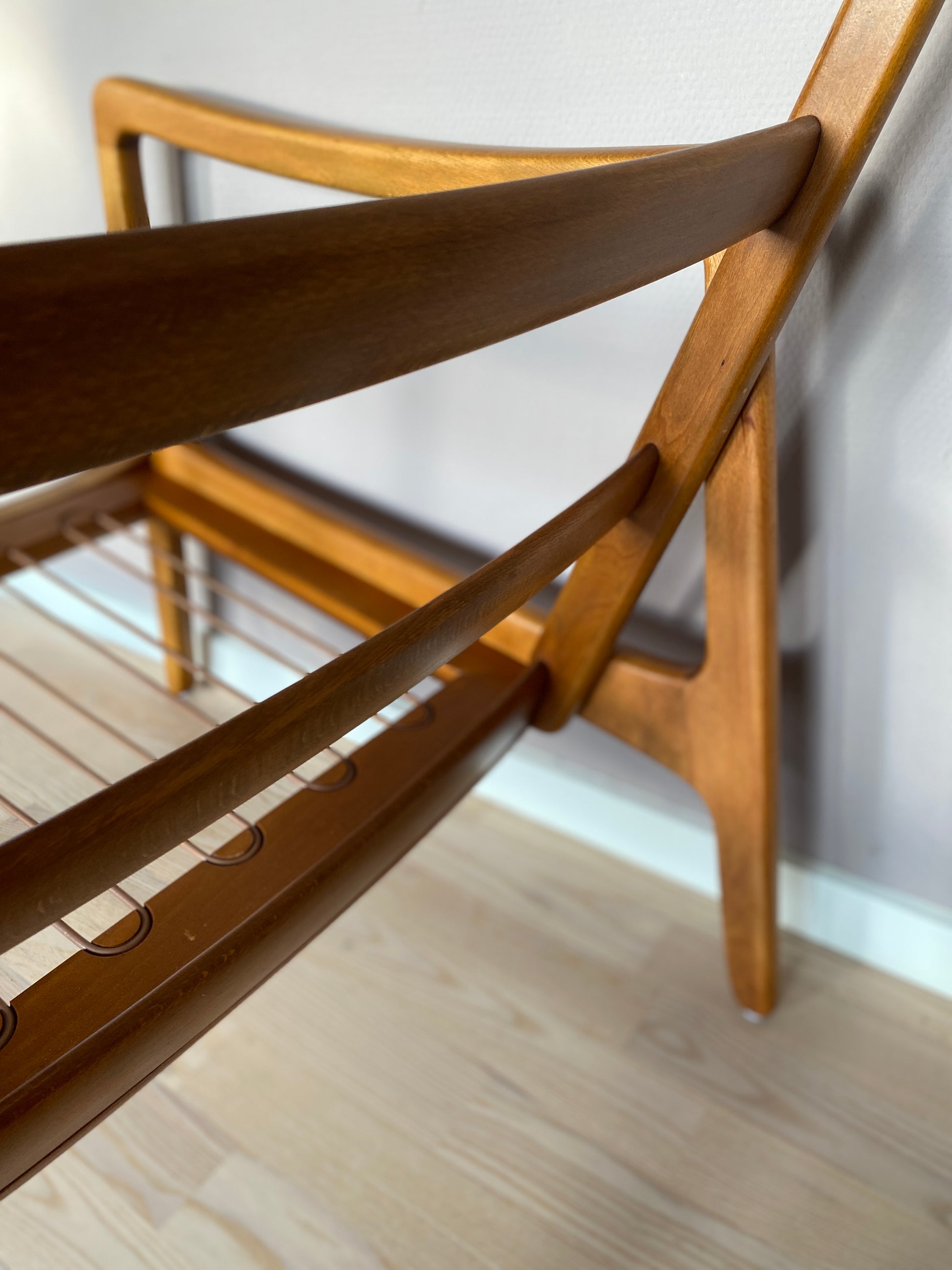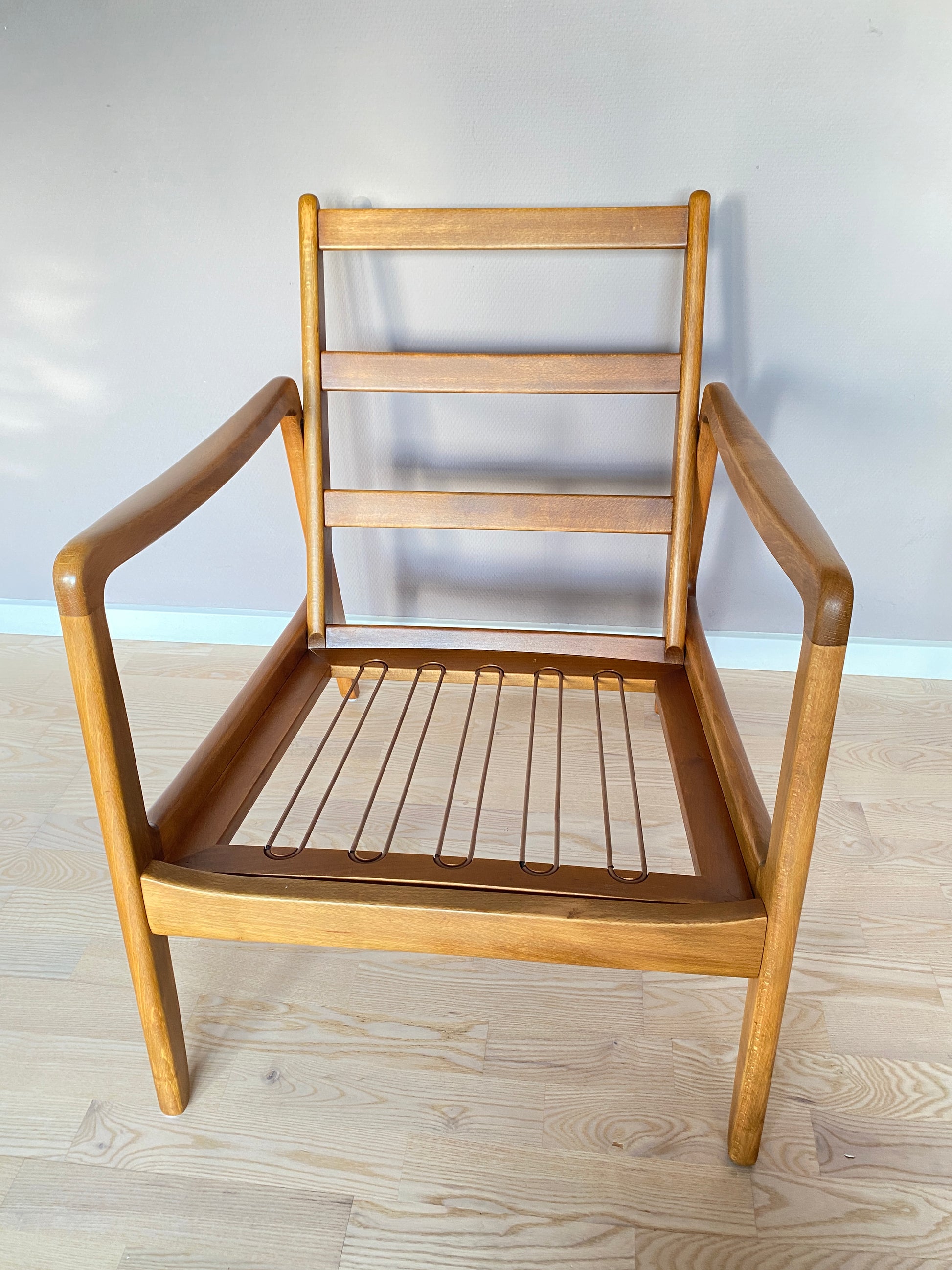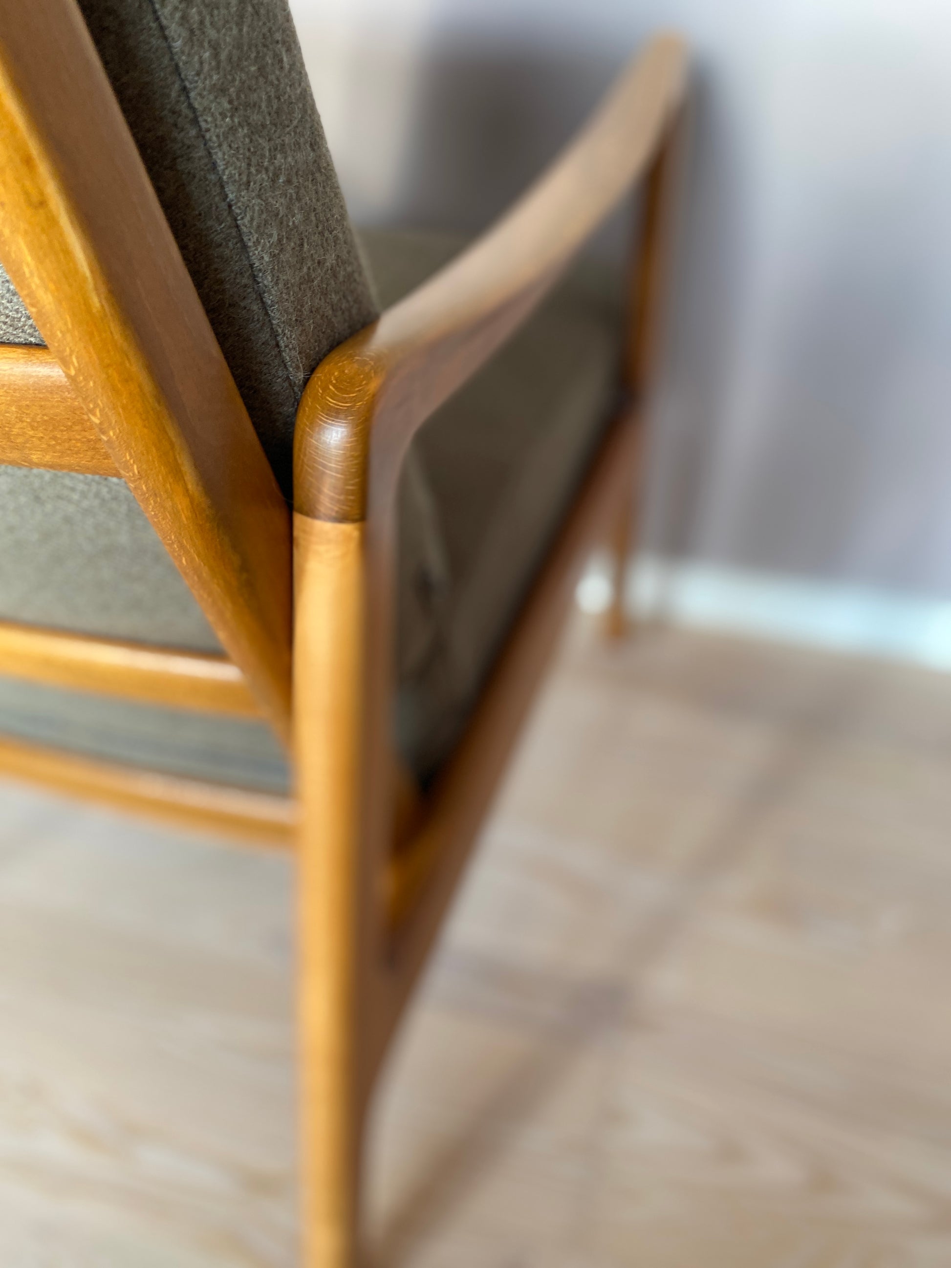 Dieser authentische Sessel aus der Mitte des 20. Jahrhunderts stammt aus der Werkstatt des dänischen Designers Ole Wanscher. Das Modell FD 109 besticht durch seine elegante Formensprache und solide Buchenholzkonstruktion von France & Søn. Der Sessel wird mit seinem originalen Sitzkissen angeboten. Die Woll-Bezüge zeigen altersgerechte Patina, die den historischen Charakter und die Authentizität dieses Designklassikers unterstreicht. Ein zeitloses Meisterstück für Liebhaber hochwertiger skandinavischer Möbeldesign.