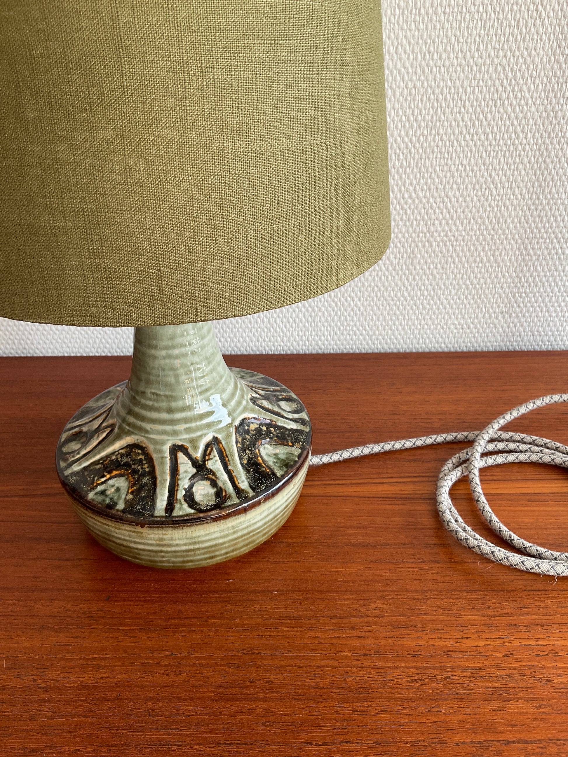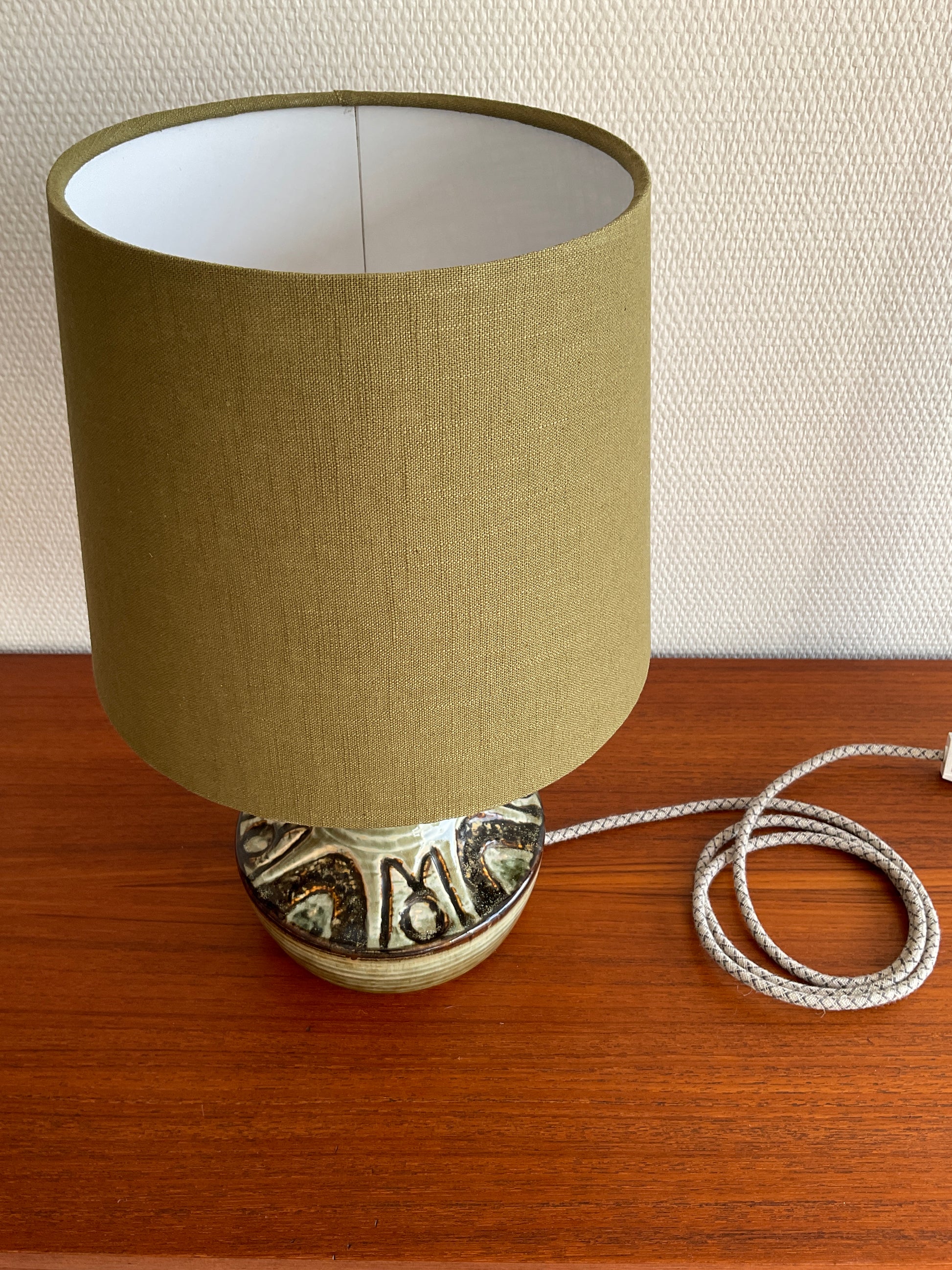 Die Lampe wurde behutsam überarbeitet, ohne ihren Vintage-Charakter zu verlieren. Sie erhielt einen neuen, handgefertigten Lampenschirm aus olivfarbenem Leinen, der sorgfältig ausgewählt wurde, um die Glasurtöne der Keramik zu ergänzen und ein warmes, stimmungsvolles Licht zu erzeugen. Die elektrische Verkabelung wurde ebenfalls erneuert und durch ein hochwertiges Stoffkabel ersetzt, das den authentischen skandinavischen Charakter der Lampe unterstreicht.