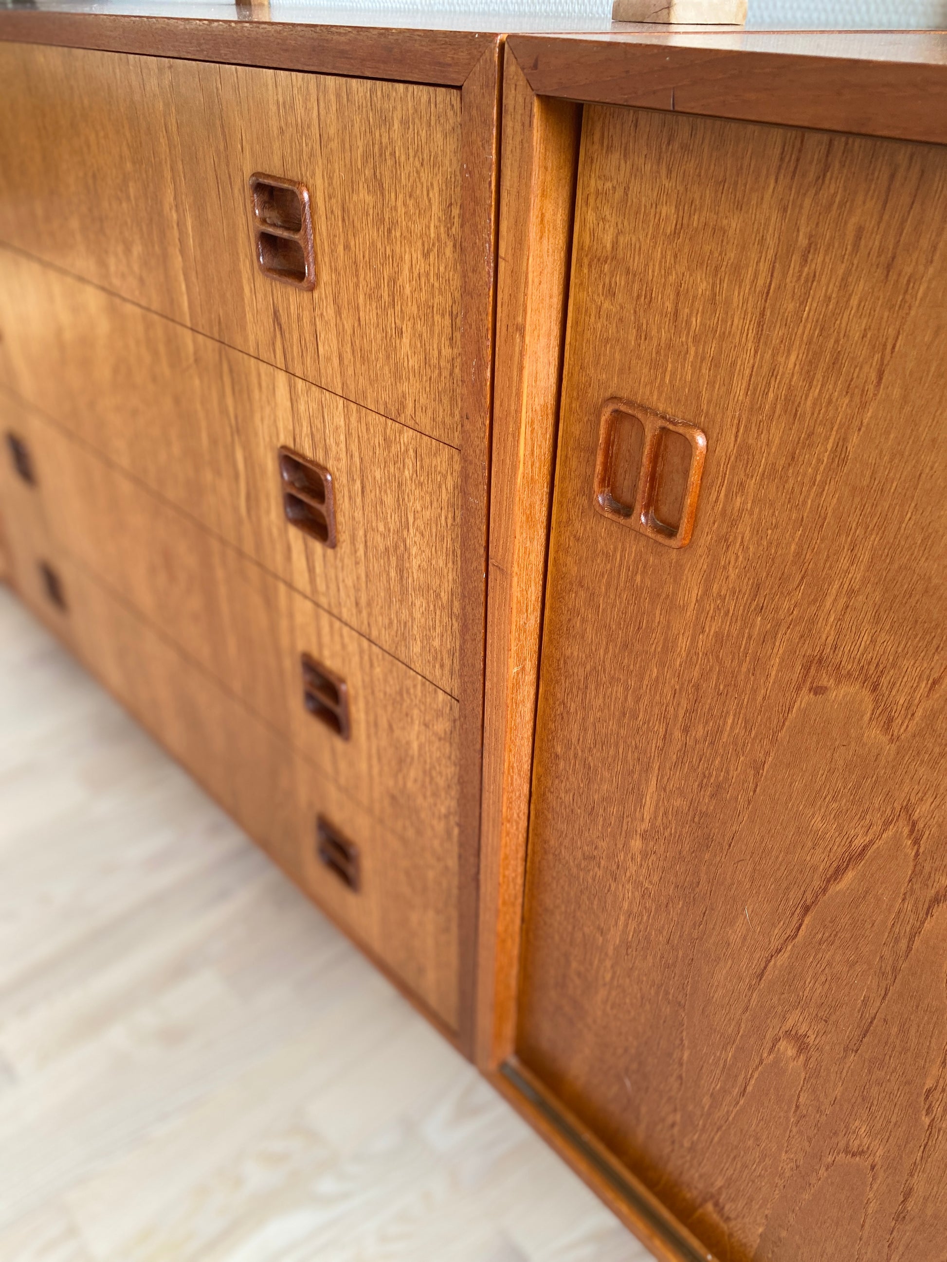 Elegantes Teakholz-Regalsystem aus den 1960er Jahren, inspiriert von Poul Cadovius' ikonischem Design. Das modulare System kombiniert charakteristische Regale von Poul Cadovius mit Schränken von einem komplementären Hersteller – eine typische Praxis der Ära, um flexible Aufbewahrungslösungen zu schaffen. Die warme Teakholzmaserung und die klaren Linien verkörpern die skandinavische Moderne. Ideal für Sammler von Vintage-Möbeln, die authentische Designstücke mit praktischer Funktionalität schätzen.