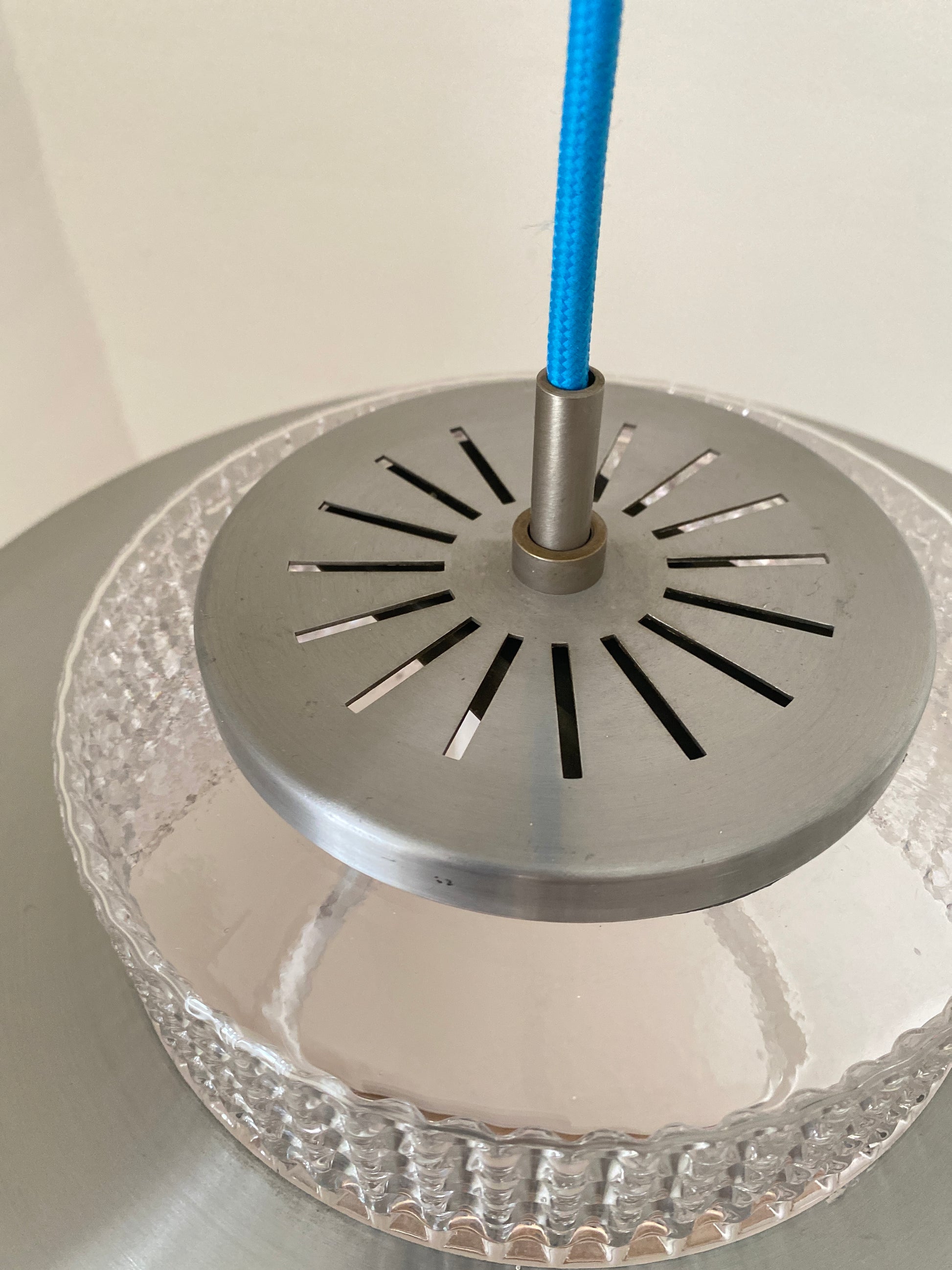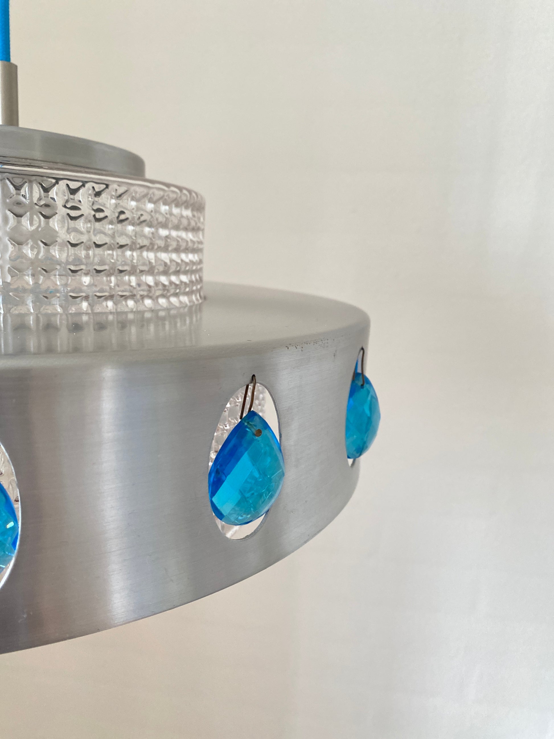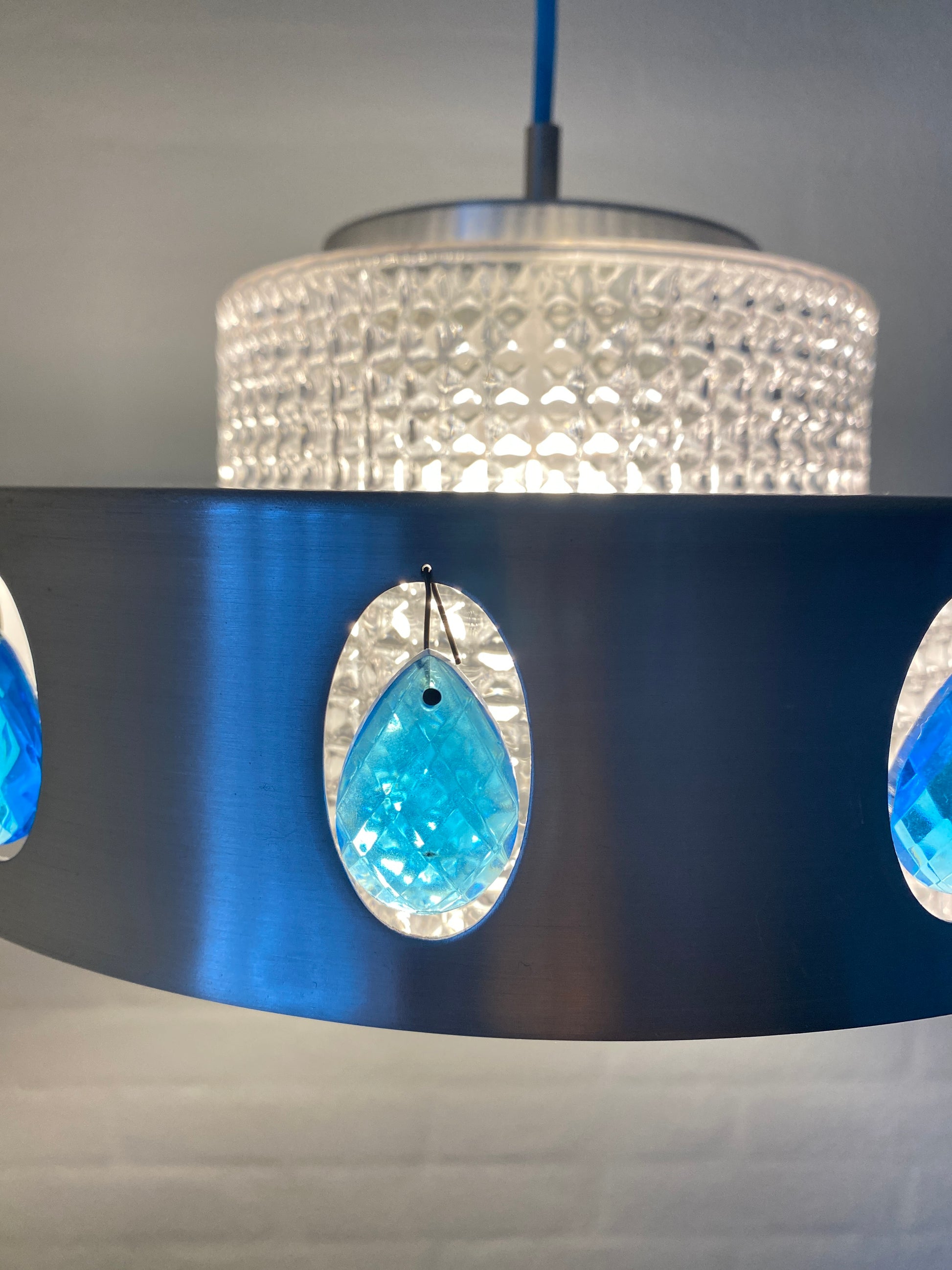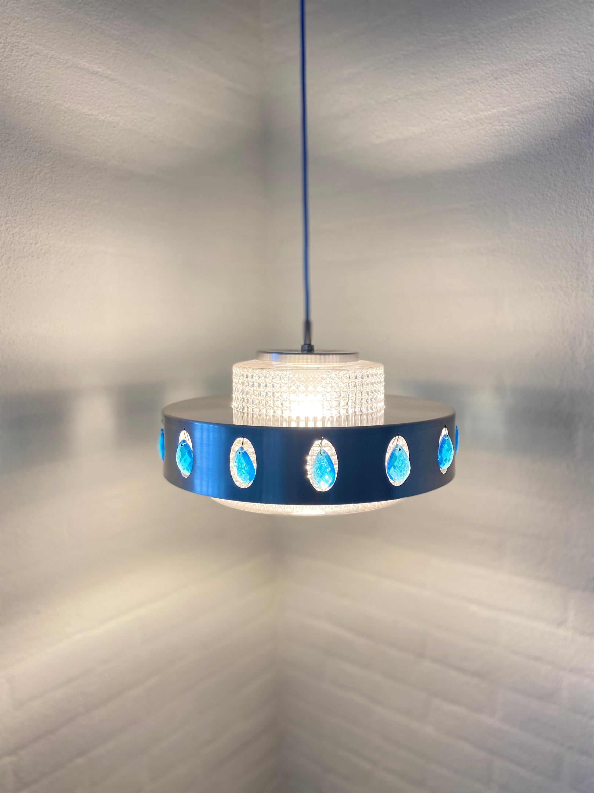 Vitrika Hängelampe mit charaktervollem Mid-Century-Design. Das Aluminium-Gehäuse wird durch elegante blaue Schmuckelemente akzentuiert und harmoniert perfekt mit dem neuen blauen Kabel. Diese Leuchte verbindet zeitlose Designprinzipien mit funktionaler Ästhetik – ideal für Räume, die klassische Moderne mit subtilen Farbakzenten schätzen. Ein authentisches Stück für anspruchsvolle Sammler und Liebhaber von Vintage-Möbeln.