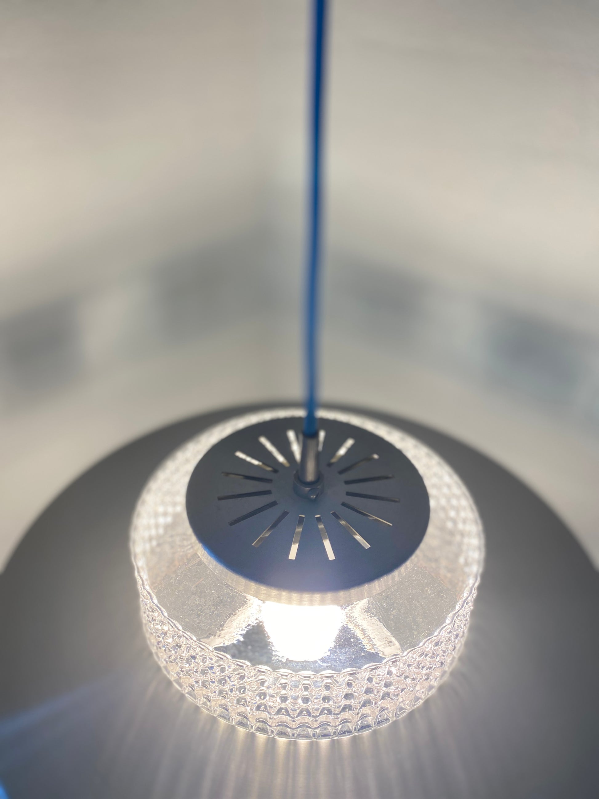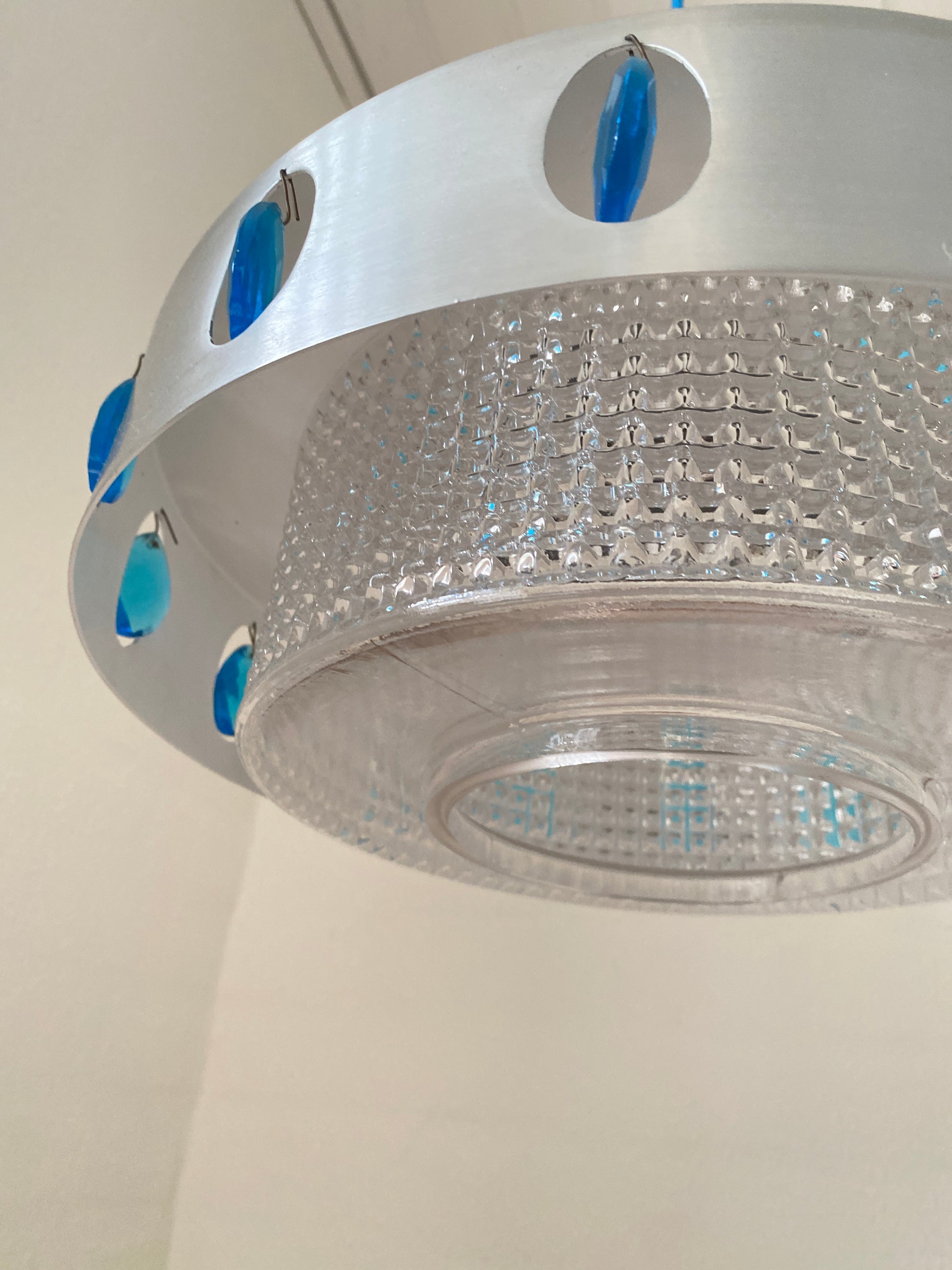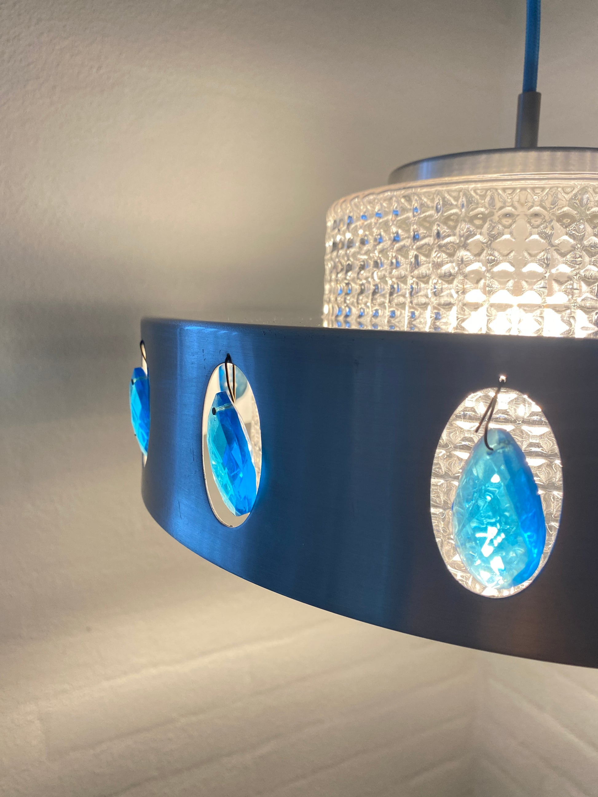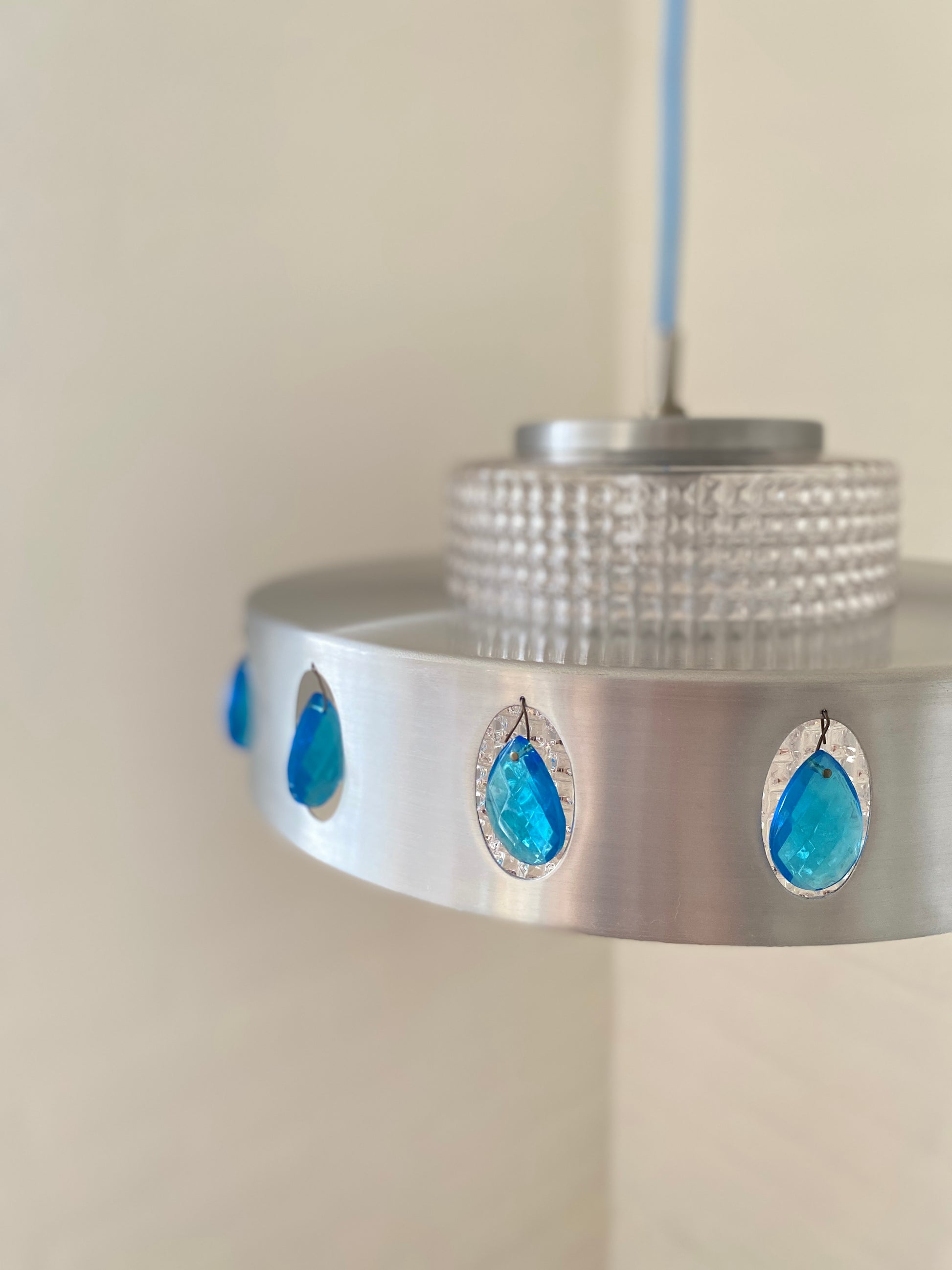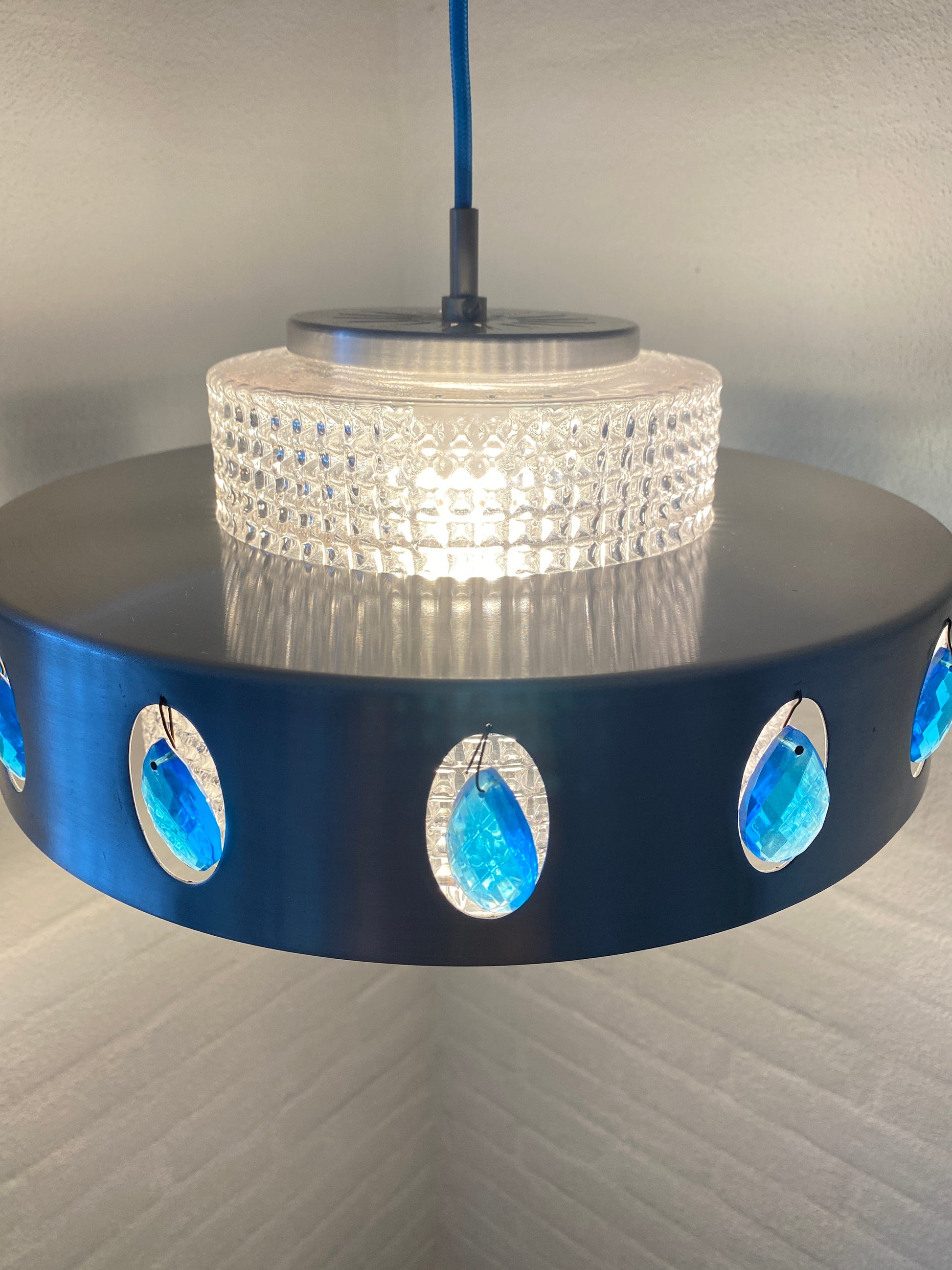 Vitrika Hängelampe mit charaktervollem Mid-Century-Design. Das Aluminium-Gehäuse wird durch elegante blaue Schmuckelemente akzentuiert und harmoniert perfekt mit dem neuen blauen Kabel. Diese Leuchte verbindet zeitlose Designprinzipien mit funktionaler Ästhetik – ideal für Räume, die klassische Moderne mit subtilen Farbakzenten schätzen. Ein authentisches Stück für anspruchsvolle Sammler und Liebhaber von Vintage-Möbeln.